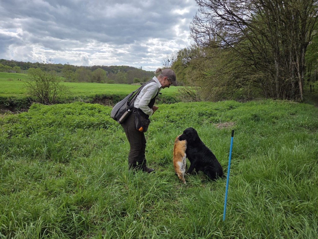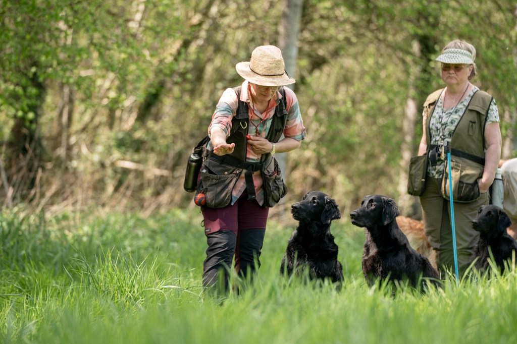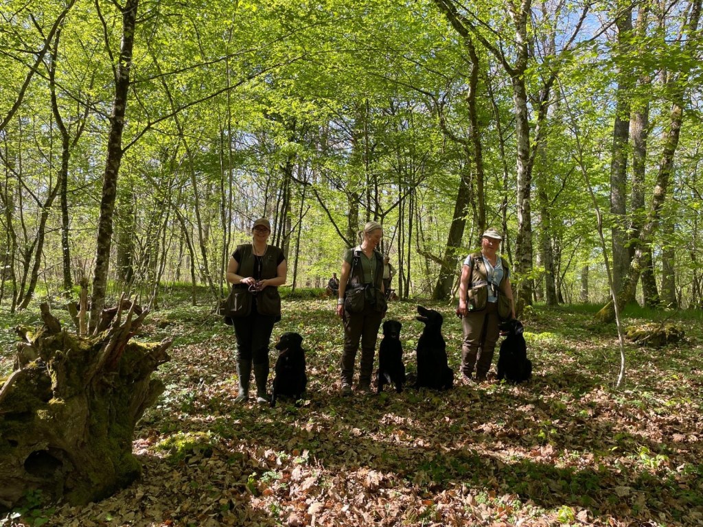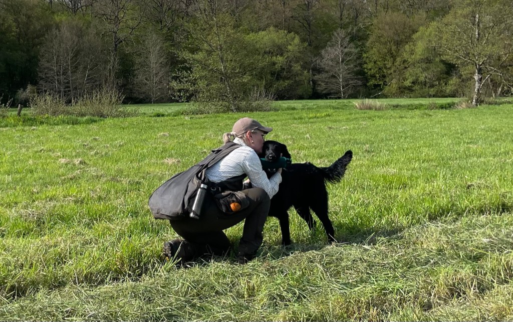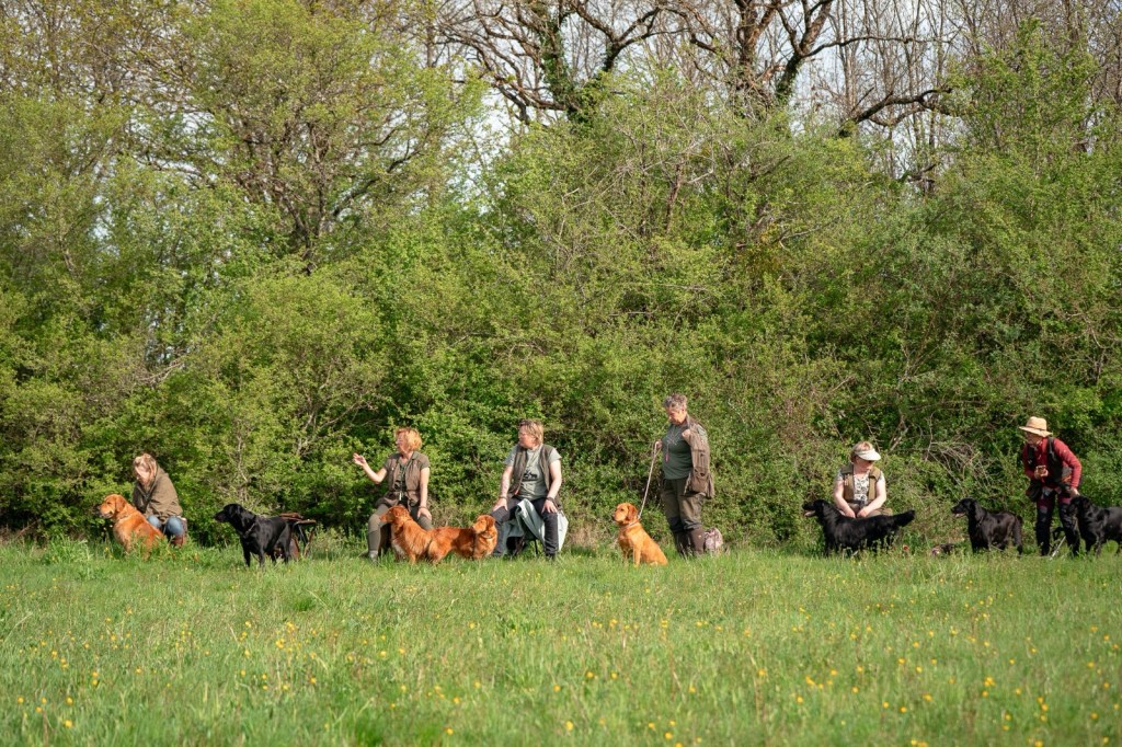 With a lovely group of Flatcoated, Toller, Golden and Labrador retrievers we enjoyed a lovely 3 days of training under the guidance of Rob Dings & Elvira van Burken. Far casts, over waterways with diversions and distractions, blinds in a forest and we were playful with a large foxskin dummy.