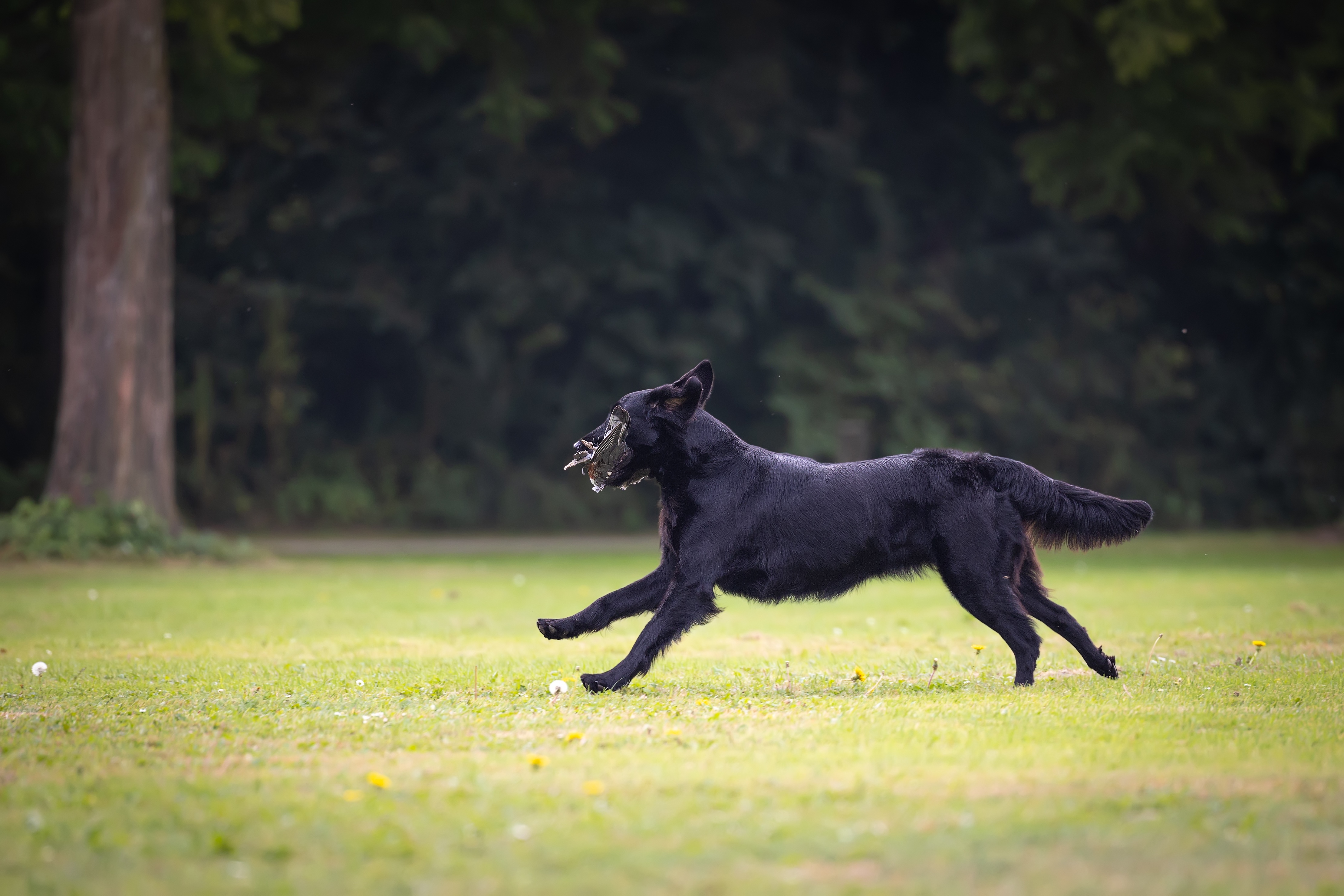 Completing the basic training of a flatcoated takes around 3 years and one must not rush things. First of all because their bodies need time to mature well and if pushed at a young age they can easily become stressed and nervous and you will loose the mental connection with them.