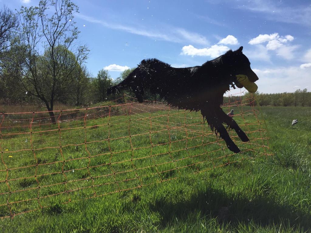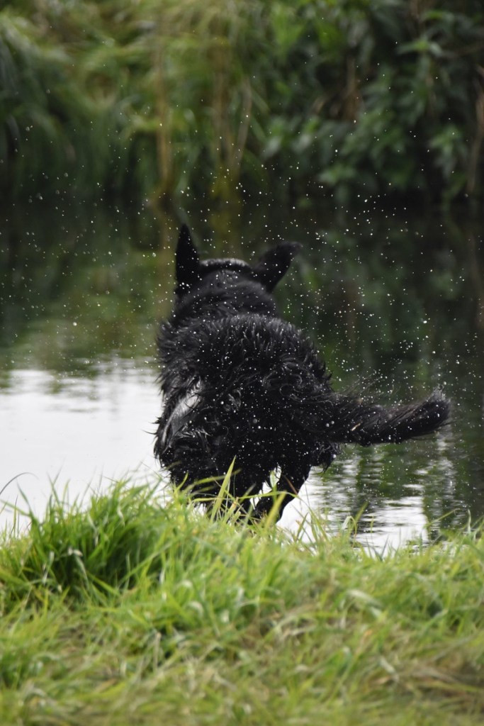 Déroy has a very friendly and enthusiastic spirit. He loves attention without being all over you at the same time. Towards other dogs he is extremely friendly and he will do all he can to prevent conflicts or having to set boundaries. Eventually he will say no, but one has to take it very far to get to that point. Towards other males he avoids aggression and with puppies he is utmost patient and playful. He is very playful with other dogs and running, tugging and bathing together are his favorite things to do together with his doggy playmates. He is very skilled in dog language and can play on the ground with the typical playing sounds of flatcoated retrievers having fun.