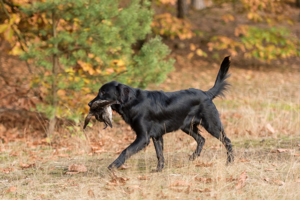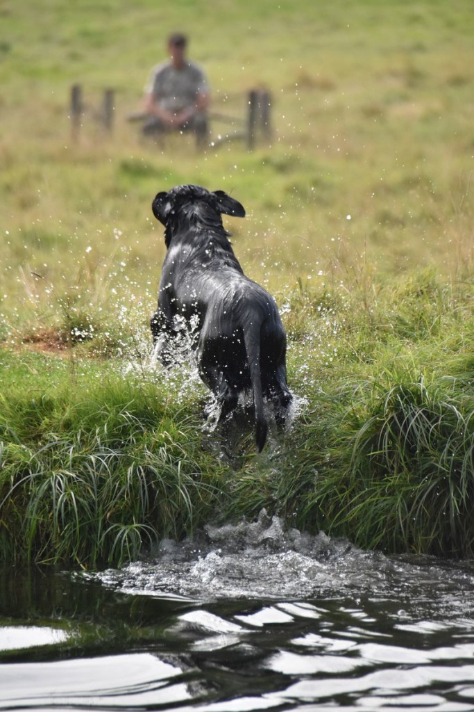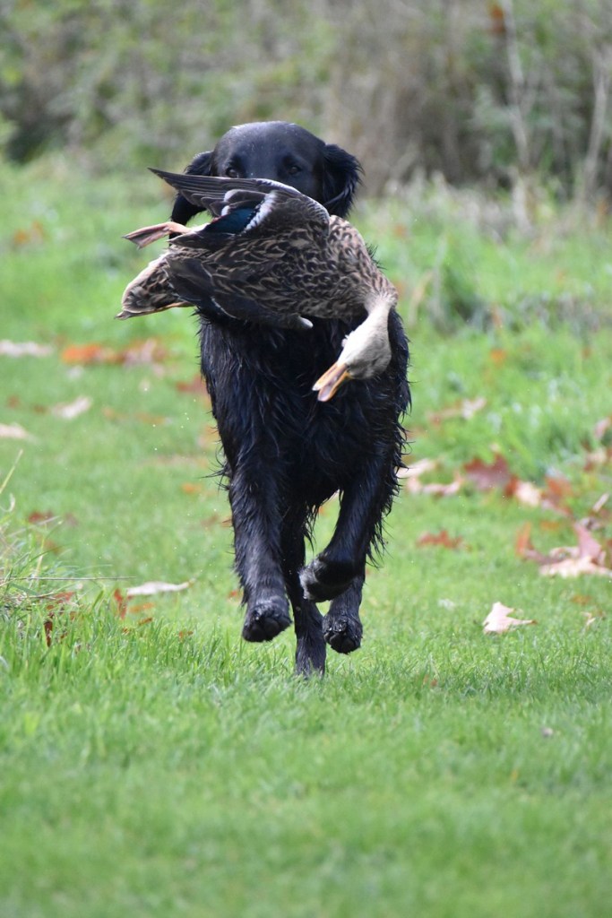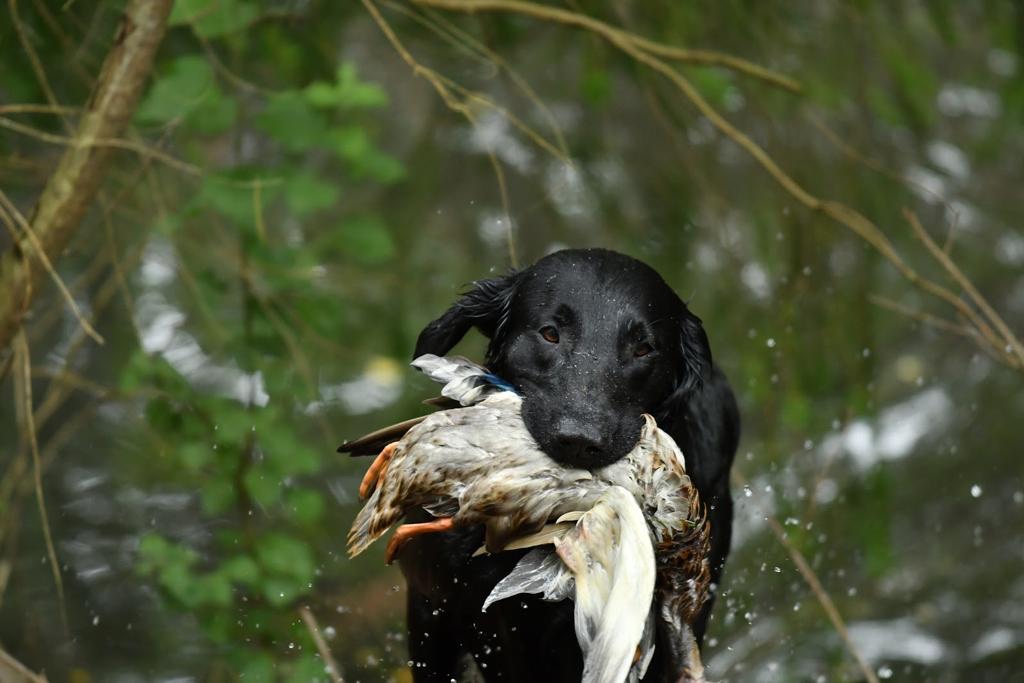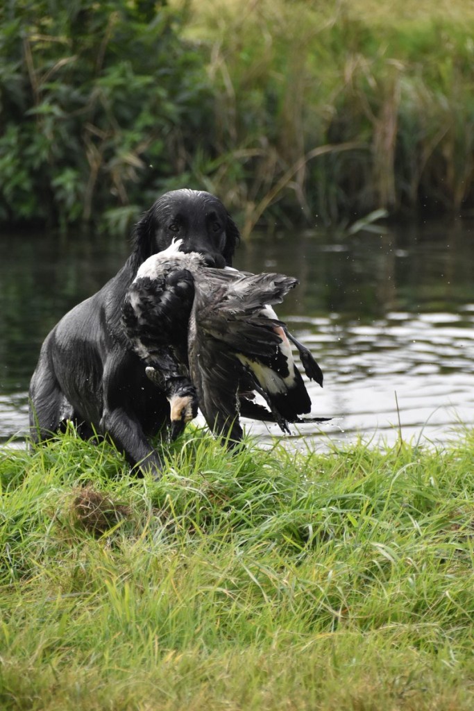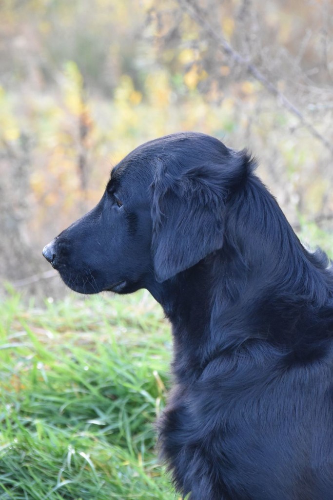 When working with his handler he shows a lot of will to please and power to fulfill the task. At a distance his flatcoated retriever mind functions very well and he easily solves problems on his own. He is very keen on doing a good job, setting him up for success is important. He has a soft nature, which is shown if a hard voice is being used. At the same time, if a handler asks silly things that makes no sense he will again switch to his problem solving mode and get the job done on his own. Déroy rarely barks at home and loves being around his family members. When hunting he has no hesitance in difficult terrain or obstacles. In my eyes he has the perfect temperament for a working gun dog.