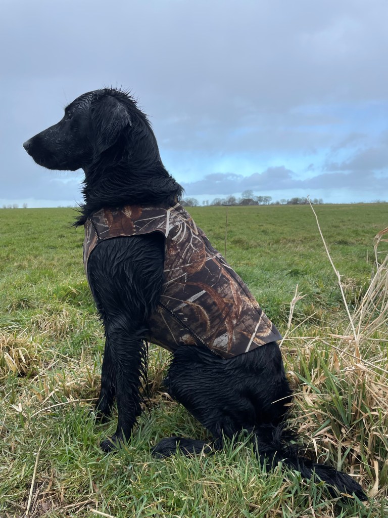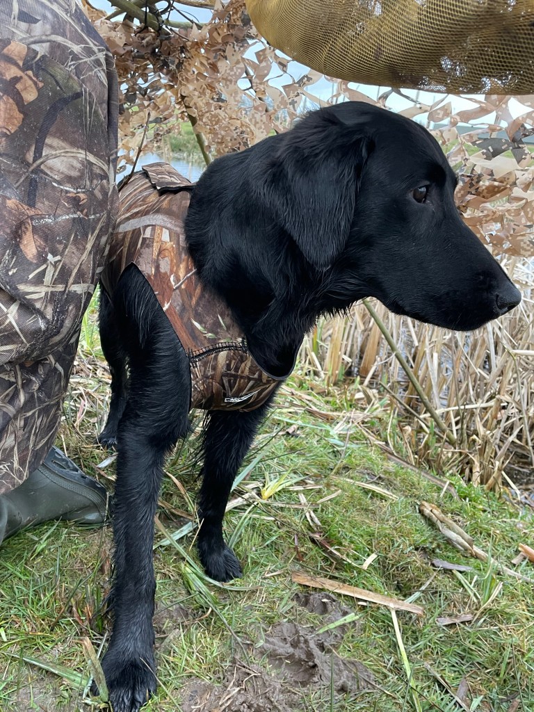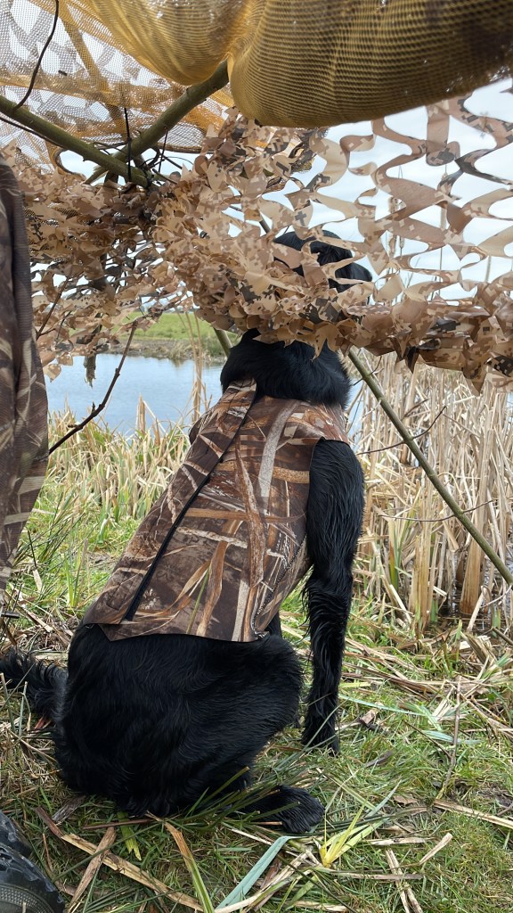 Hunting goose on open fields requires a bit of camouflage when you have a shiny black coat