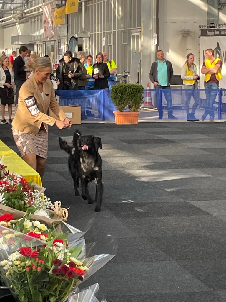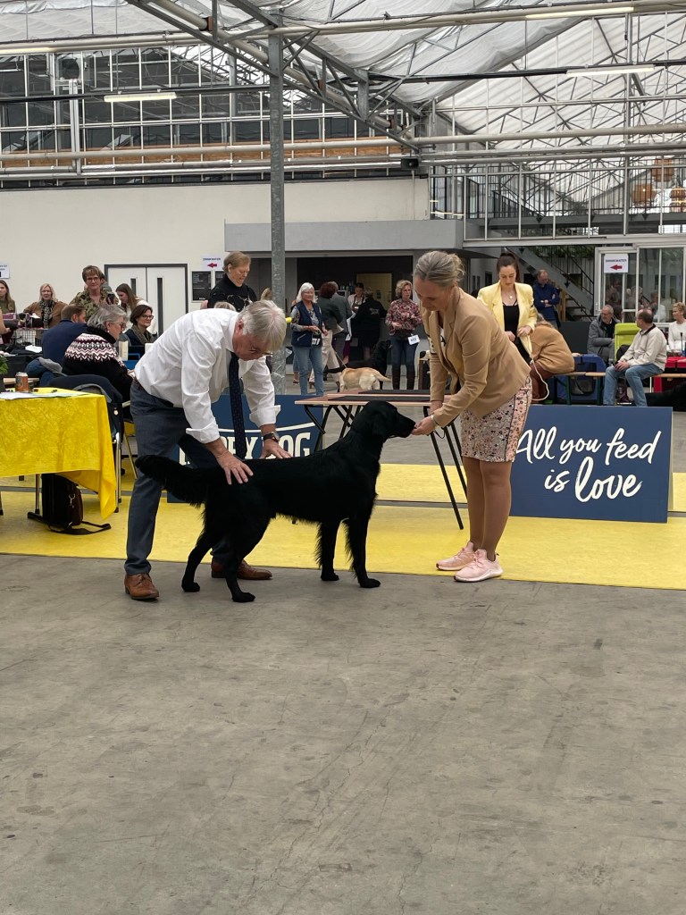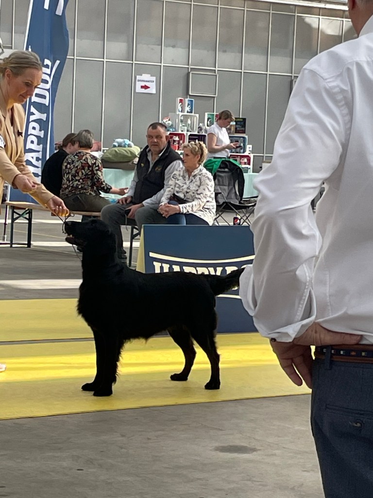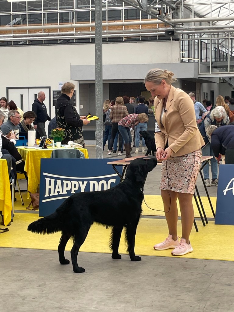 On Saturday the 4th of March 2023 the flatcoated retriever club held a working test that I had entered with Lotte. Unfortunately she is full in heat so I decided to go to the international Martini dogshow in Groningen instead. Klaas the owner of Flatastic Silver Will “Bruce” had asked me to bring out his lovely strong boy. Bruce has not had ringtraining or ever been to a show so it was quite an experience for him. I am very proud of this wonderful boy – he has a strong body and an enormous perseverance when working. He retrievers everything with feathers and hair, it is rather impressive what he is already capable of at this young age. He will track a deer for his hunter, retrieve a fox – but he also has obtained his two Orweja SJP diplomas and he is now approved for breeding. He has finished all his health tests including an ultrasound of the kidneys and he has tested clear of hereditary diseases. He is of medium size – his type is traditional (English). His head is very maskulin – maybe it could have a bit less defined stop but this fits his type I think. He has excellent movements with a lot of thrust and a very bright and engaged temperament. In many ways he reminds me of Rumi, which touches me. I am very much looking forward to following him and his owner in the future in their ventures.