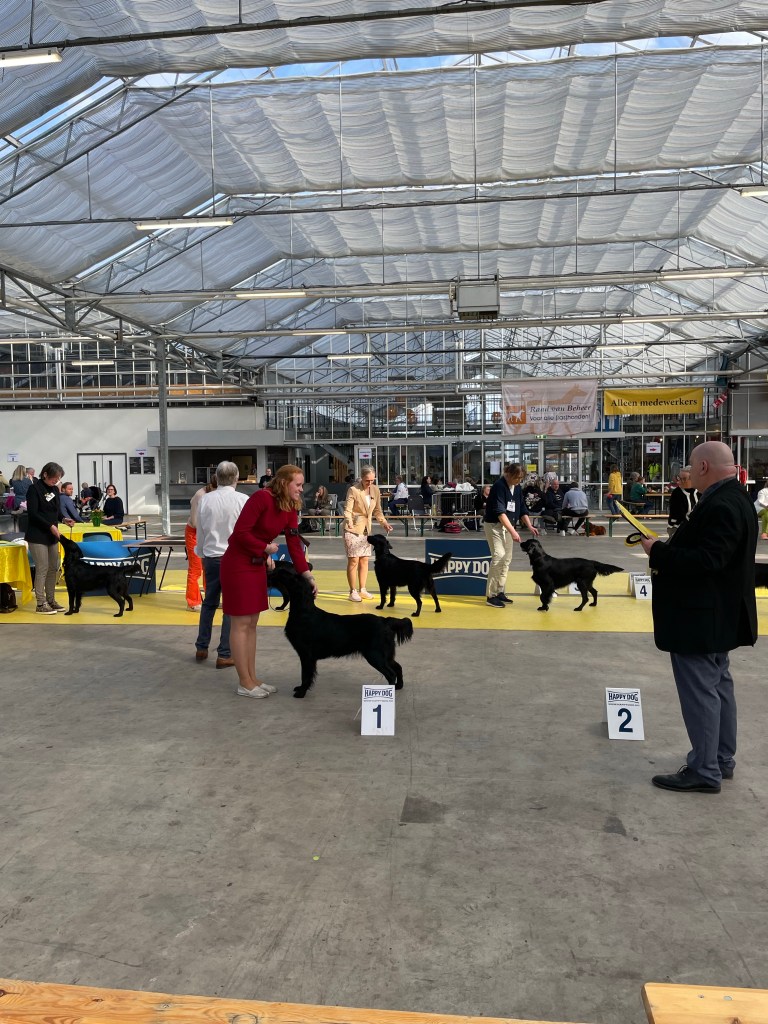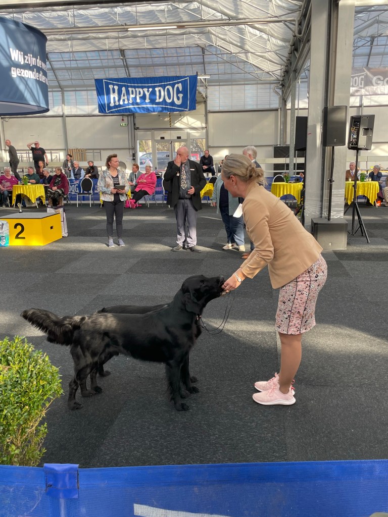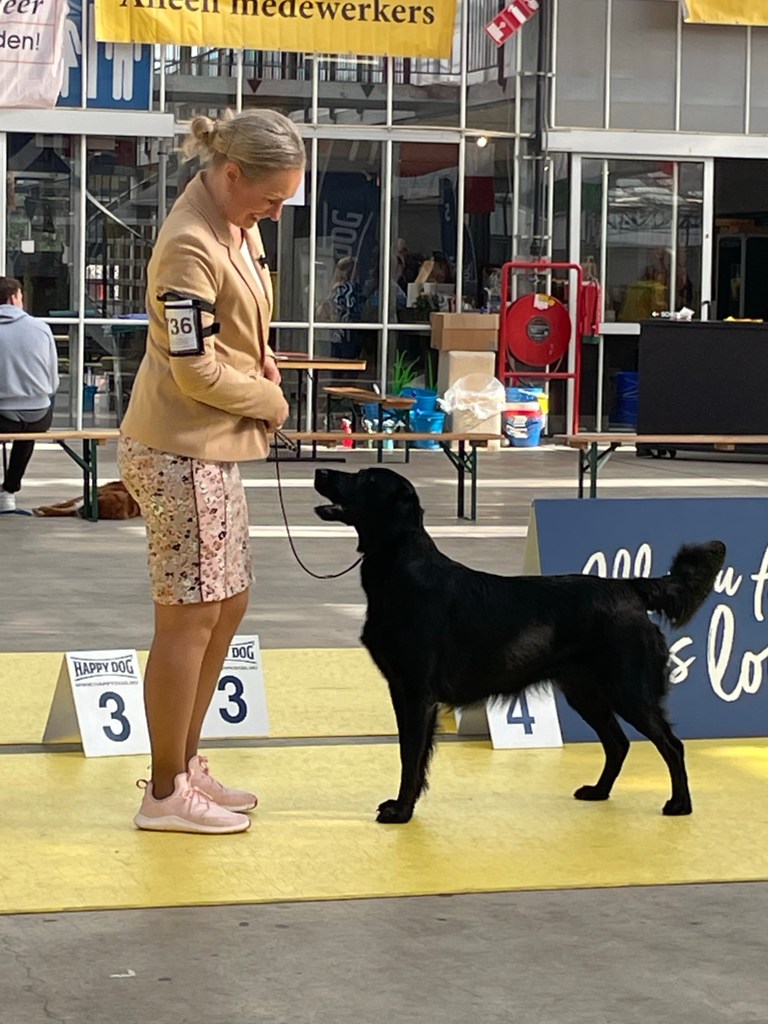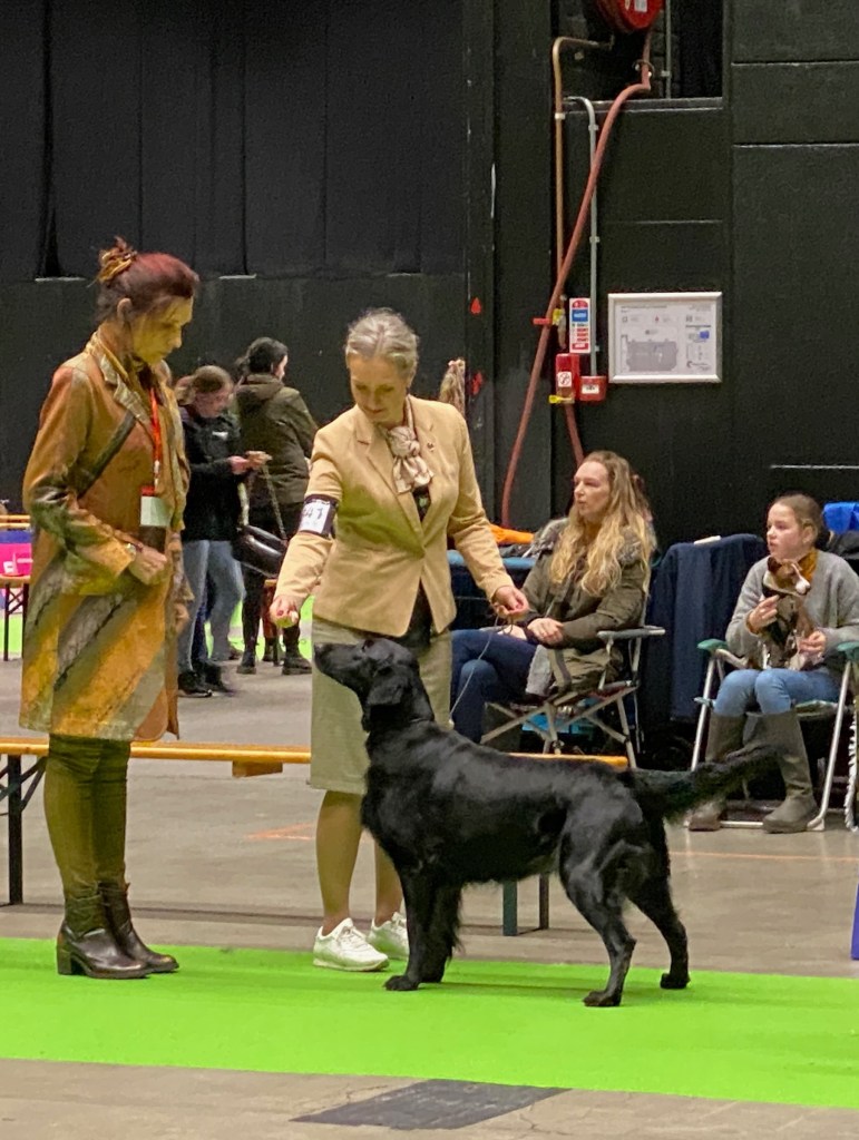 On Saturday the 4th of March 2023 the flatcoated retriever club held a working test that I had entered with Lotte. Unfortunately she is full in heat so I decided to go to the international Martini dogshow in Groningen instead. Klaas the owner of Flatastic Silver Will “Bruce” had asked me to bring out his lovely strong boy. Bruce has not had ringtraining or ever been to a show so it was quite an experience for him. I am very proud of this wonderful boy – he has a strong body and an enormous perseverance when working. He retrievers everything with feathers and hair, it is rather impressive what he is already capable of at this young age. He will track a deer for his hunter, retrieve a fox – but he also has obtained his two Orweja SJP diplomas and he is now approved for breeding. He has finished all his health tests including an ultrasound of the kidneys and he has tested clear of hereditary diseases. He is of medium size – his type is traditional (English). His head is very maskulin – maybe it could have a bit less defined stop but this fits his type I think. He has excellent movements with a lot of thrust and a very bright and engaged temperament. In many ways he reminds me of Rumi, which touches me. I am very much looking forward to following him and his owner in the future in their ventures.