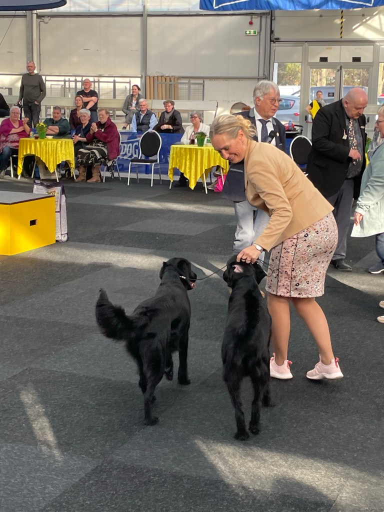 For the fun of it I had entered Lotte and Kaspar in the couples class. I simply enjoy taking the long run in the hounory ring on the felt carpet and showing my breed. It is hard to beat the elegance of two long running flatcoated retrievers. It is just lovely to watch – regardless who’s dogs they are.