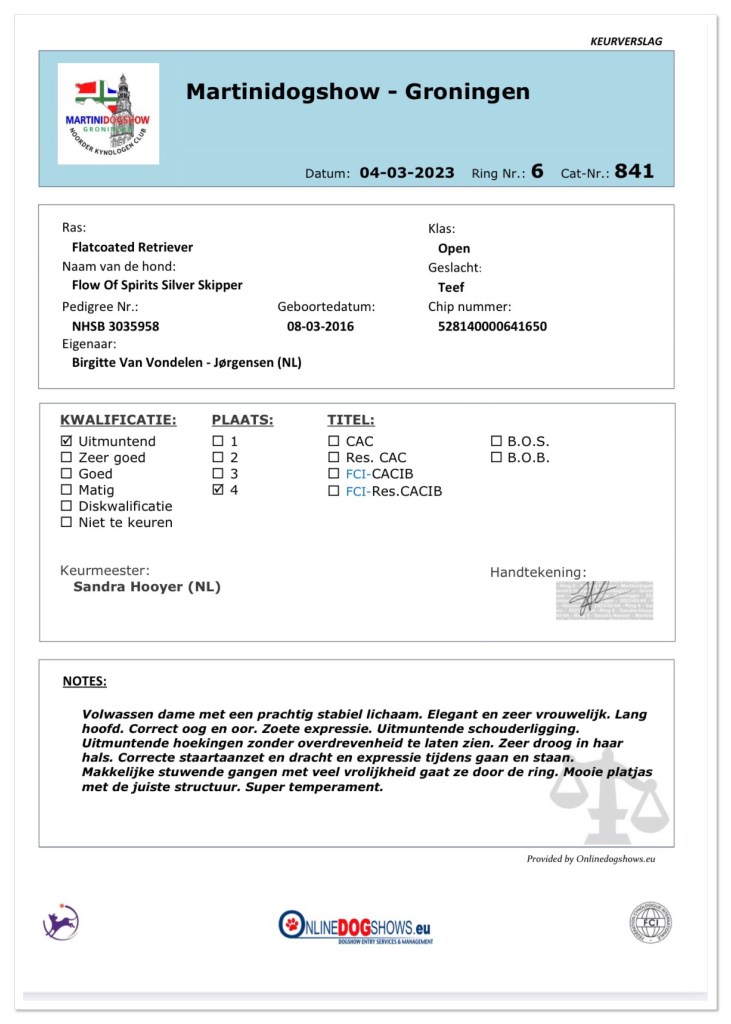 Flow of Spirits Silver Skipper “Rumi” at the Martini Int Dogshow“Grown up lady with wonderful steady body. Elegant & very feminin. Long head, correct eye and ear. Sweet expression. Excellent schouder placement. Excellent angulation without extremes. Very dry in the neck, correct tailset and carriage of tail and expression while walking and standing. Easy and thrusting movements-runs with joy in the ring. Beautiful flatcoat with the right strict. Super temperament.”Photos kindly made by Marga Jongholt