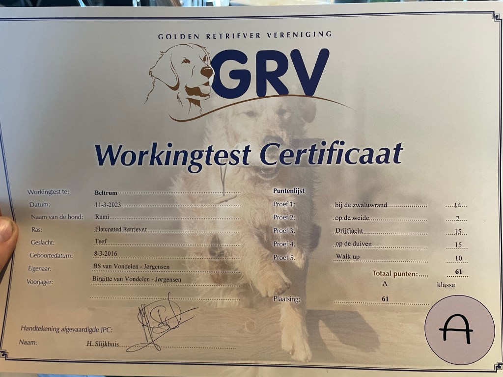 A week ago I drove to the east of the Netherlands to participate in a working test A with Rumi. The working test was designed by Henk Slijkhuis and the difficulty level was high and contained a lot of obedience and steadyness with walk-ups and distractions. It was hard work for us as Rumi is strong minded and not the calmest dog to handle. I was very pleased with her performance though and a bit irritated about my own mistakes. Plenty of space left to learn though.