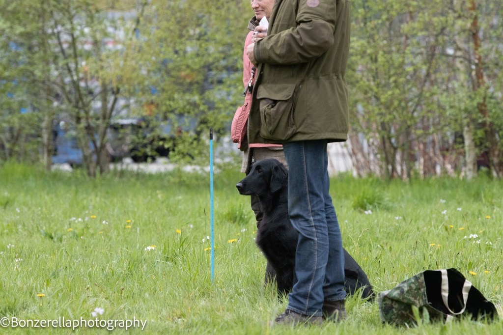 2nd post the dogs were left to watch the previous team. Rumi’s speciality is to “count and remember birds” so this was really not in our advance – 6 retrieves – helpers all over the field – cold game in front of us on the grass. When I had to begin the blind cast passing two helpers – through some trees ending in a doorway of two dots of forest.. it cost a lot of handling.. but she ended up where I wanted her and she did not find the dummy. What a disappointment. Then I had to recall her passing one dummy and 2 doves in the field. Managed well – who would have thought. The second retrieve – a blind in the forest she missed too. She did not want to go searching in the forest – can you blame her with the eye experience?