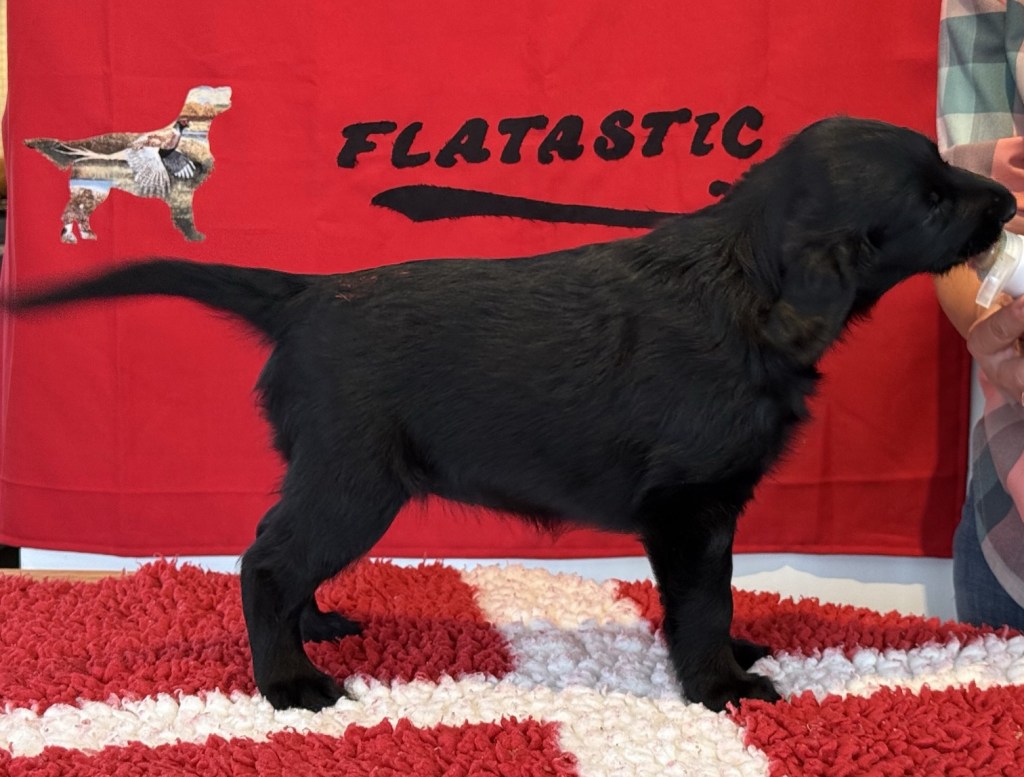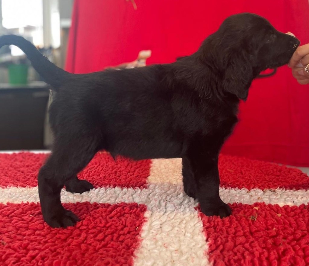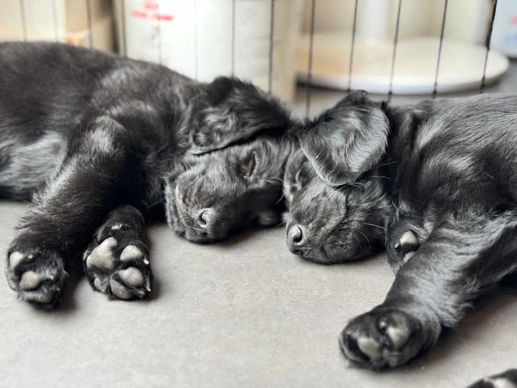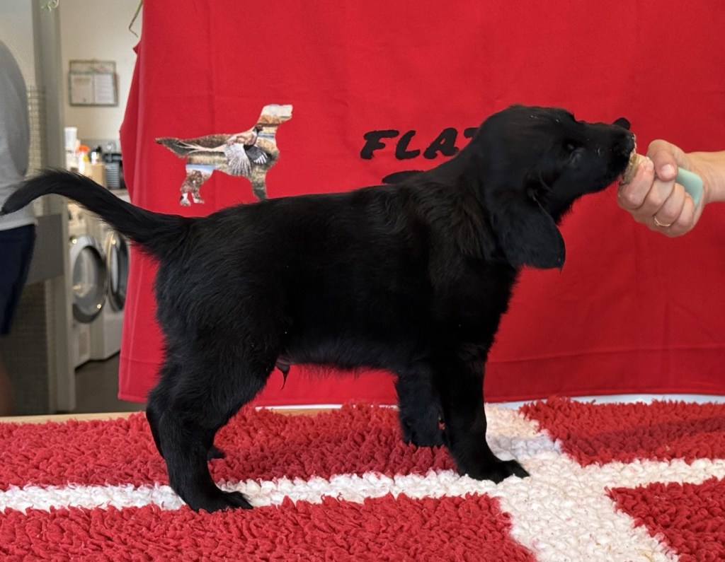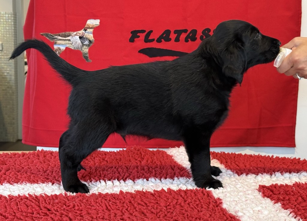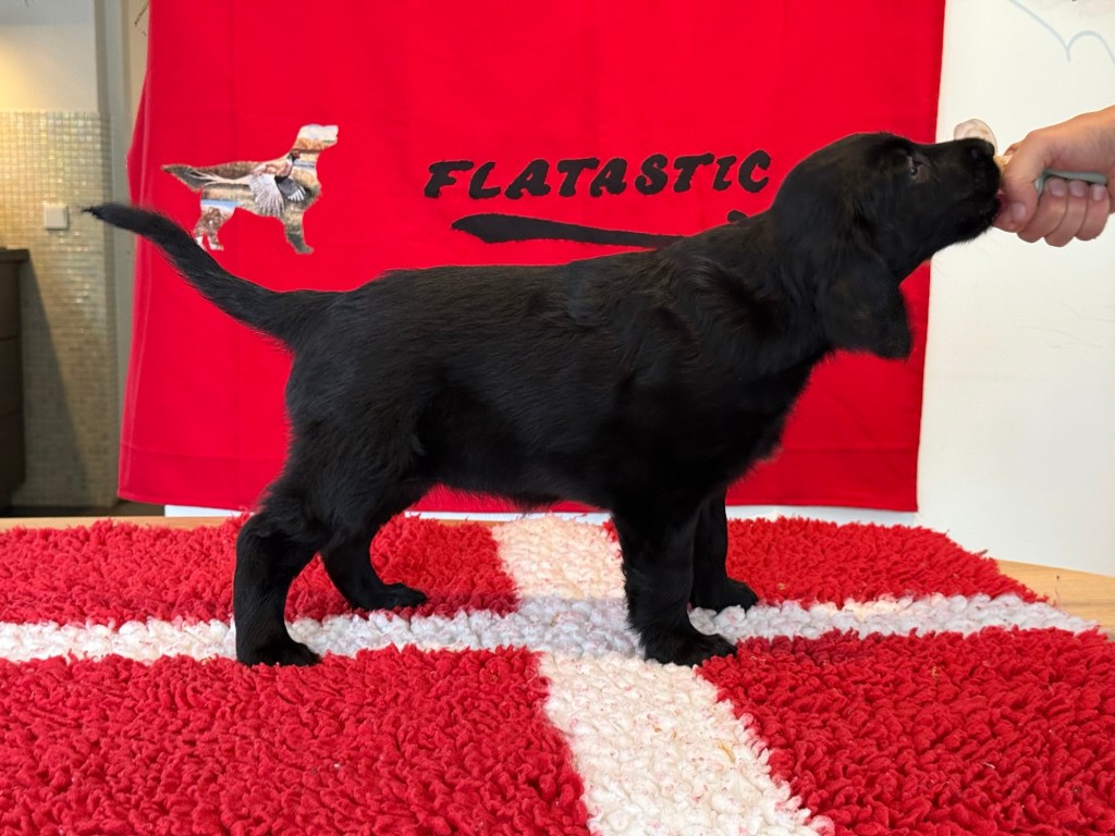 Taking care of 5 grown flats is a day job on its own – on top of that the small “bandits” are asking more and more entertainment and attention. They are now 7 1/2 weeks old and we have had them tracking on deer skin and retrieving wildboar feet and several dried wings of different birds. One the big game there was a difference on how keen they were on owning it, on the retrieves they are show a lot of retrieving potential. One of them has a higher “keep it to myself” attitude but the whole are very willing to retrieve and bring even after several retrieves. The FRC puppy test did not surprise us – very biddable, social and engaged puppies with reliable temperament. Very happy with the results.