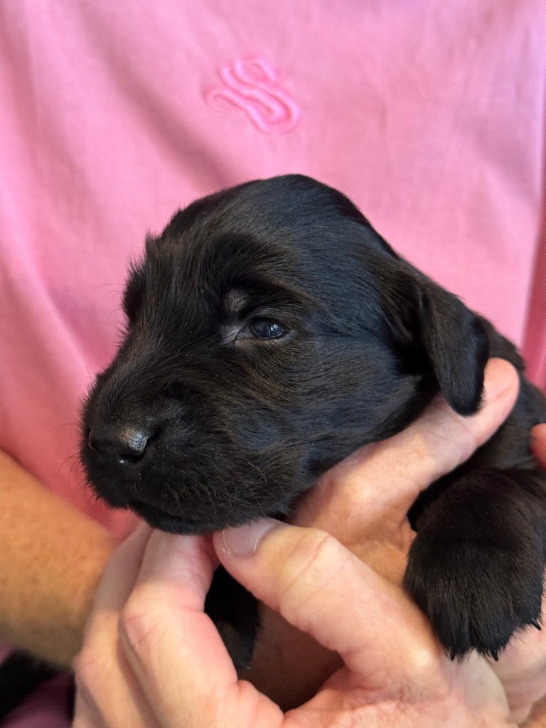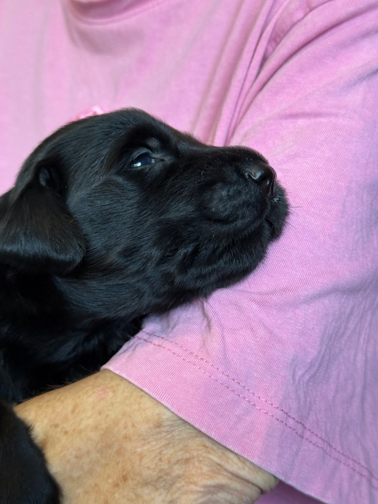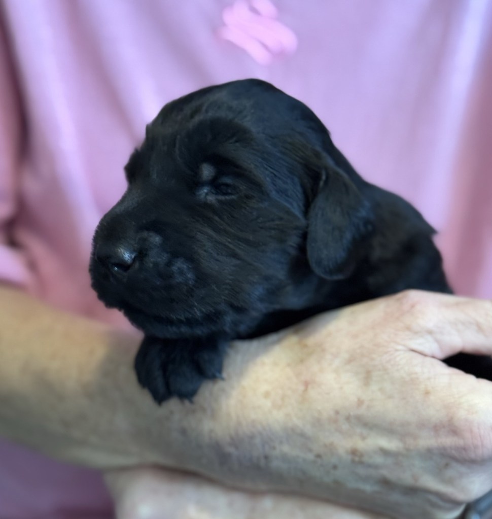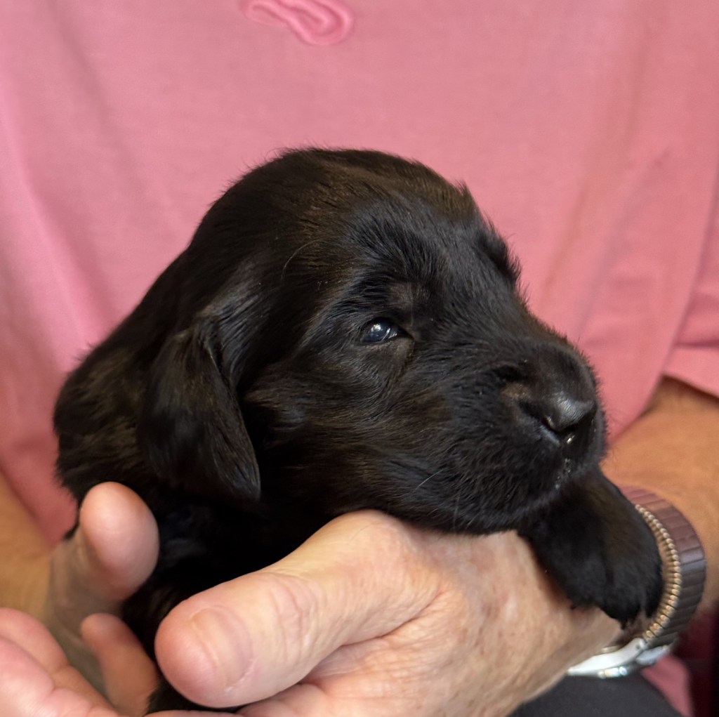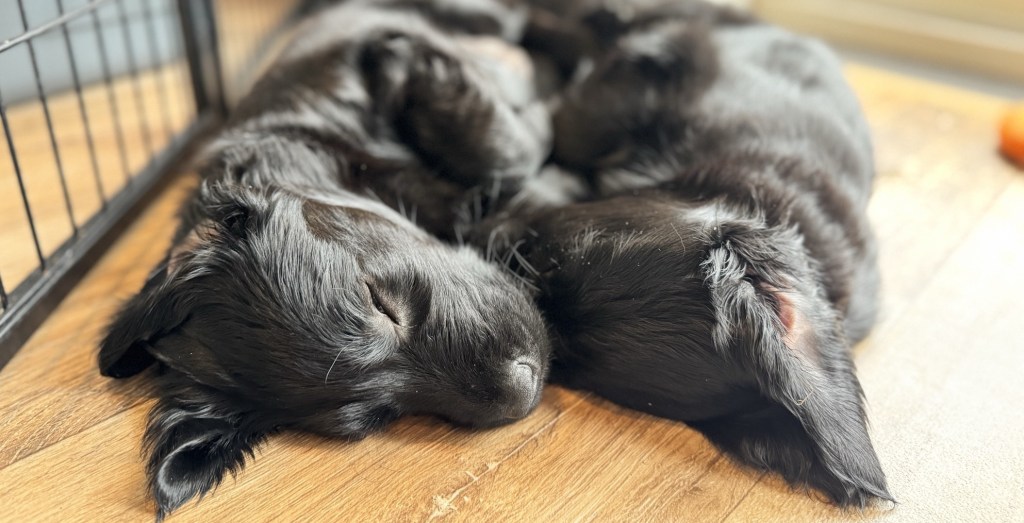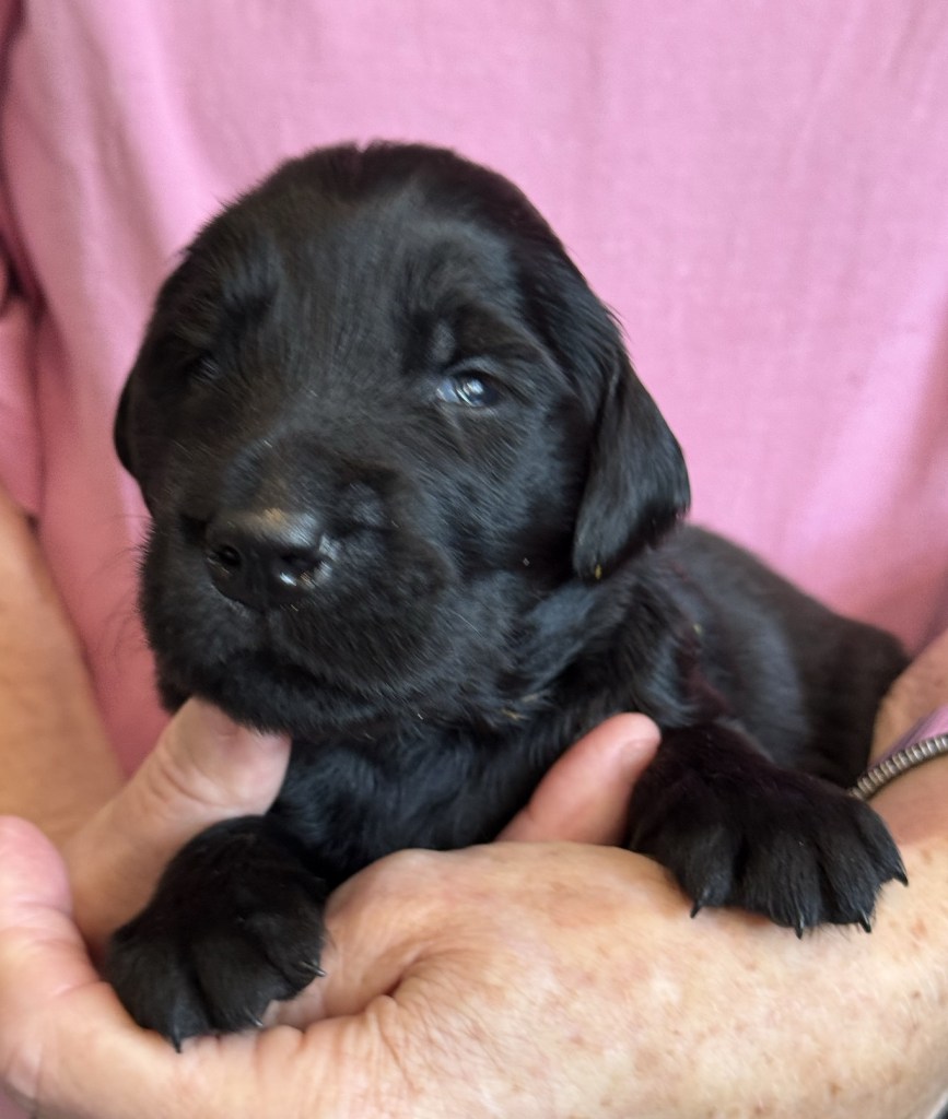 Taking care of 5 grown flats is a day job on its own – on top of that the small “bandits” are asking more and more entertainment and attention. They are now 7 1/2 weeks old and we have had them tracking on deer skin and retrieving wildboar feet and several dried wings of different birds. One the big game there was a difference on how keen they were on owning it, on the retrieves they are show a lot of retrieving potential. One of them has a higher “keep it to myself” attitude but the whole are very willing to retrieve and bring even after several retrieves. The FRC puppy test did not surprise us – very biddable, social and engaged puppies with reliable temperament. Very happy with the results.
