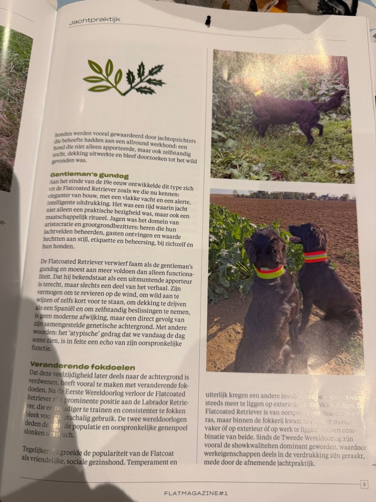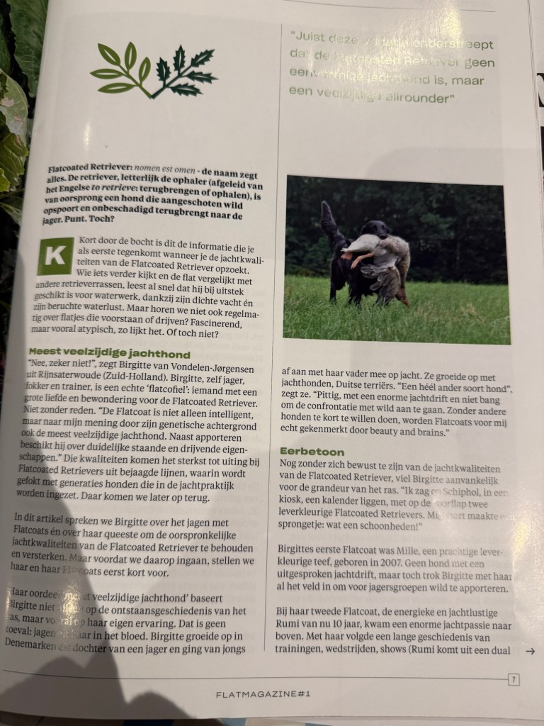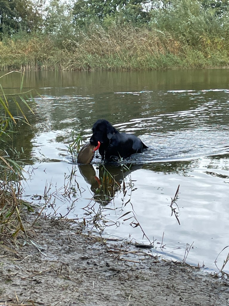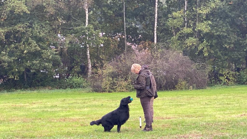 Understanding the flatcoated retriever and her unique way of working is essential. She needs some freedom and respect of her intelligent way of solving things and will loose eagerness if drilled too much. At the same time she needs clear guidelines and communication. As a handler it is a challenge to move between these two poles, searching for the right balance of both. Furthermore, play is very essential – make sure to use it in your advantage before the dog finds his way of playing on his own.